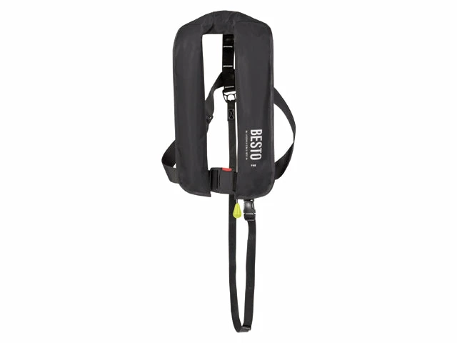 The Besto 165N Inflatables have a good body fit due to the soft outer cover and special neck shape. The collar is strapped onto the back, this gives a comfortable neck fit, it also gives a good neck/head support when the jacket is inflated. The jacket comes with a crotch strap as standard, to enhance performance and freeboard. The jacket is finished with edge binding all-around. It has a buoyancy of 165N. The jacket is available in various versions such as: automatic or manual, with or without safety harness and in various colours.