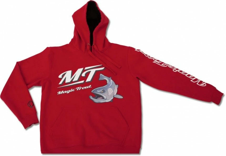 Beautiful red hoodie with Magic Trout prints for fishing. This hoodie with hood is 100% made of cotton and provides comfort, warmth and protection during a day of fishing.