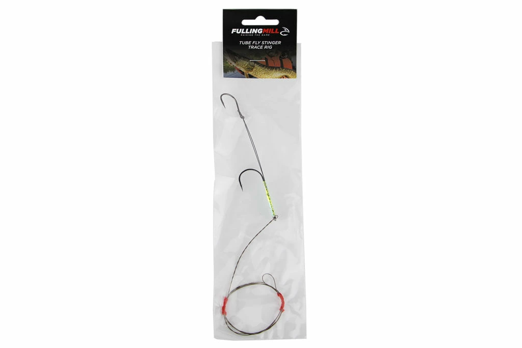 A stinger trace rig, to be used in conjunction with Fulling Mill Pike Tube Flies. Slide the loop of the trace through the plastic tube of your fly and seat the eye of the hook in the rear of the tube. The trace is then attached ‘Loop to Loop’ to your fluorocarbon leader.