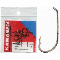The K60 Worm hook from Kamasan is a reliable, functional bronze bait holder hook. For worm fishing for Salmon, Trout, Sea-Trout and is espcially useful for Pike and Perch. It’s design is often what all other bait hooks are based on. Forged bend with offset & beak points, it has the bait holder slices on shank and a turned down ball hook eye.
