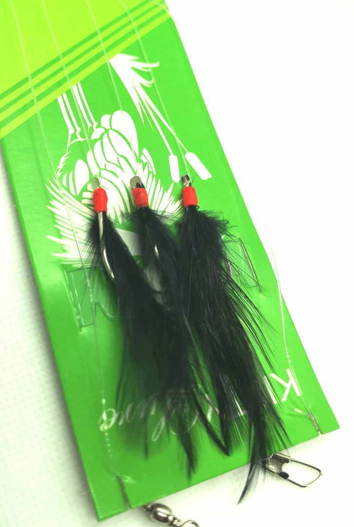 Kilty Cod Feathers 3/0 Black. Traditional 4 hook cod rig with black feathers tied on 3/0 hooks and the addition of a modern twist with the incorporation of holographic flashabou.