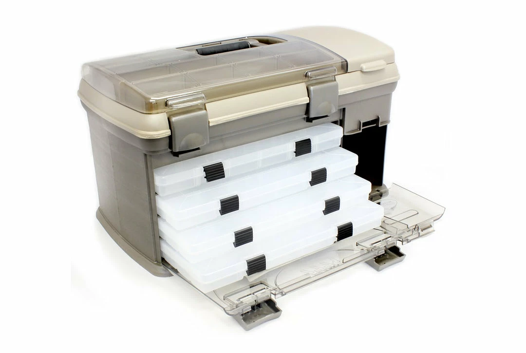 Make sure your tackle is neat and organized before you head out on your next fishing trip with the Plano Guide Series Drawer Box. It is designed with top access and four 3700 series Stowaway utility boxes in the lower compartment to keep your items right where they belong. Use the utility storage box for baits you want quick access to while you are out fishing. Use the utility drawers below for other essential items for your fishing trip. The storage boxes on the Plano fishing tackle box slide in and out easily and can be interchanged for even more convenience. The high-impact covers keep your items covered, while the safety latches secure everything inside. The handle on top makes it easy to carry the tackle box to and from your fishing site.