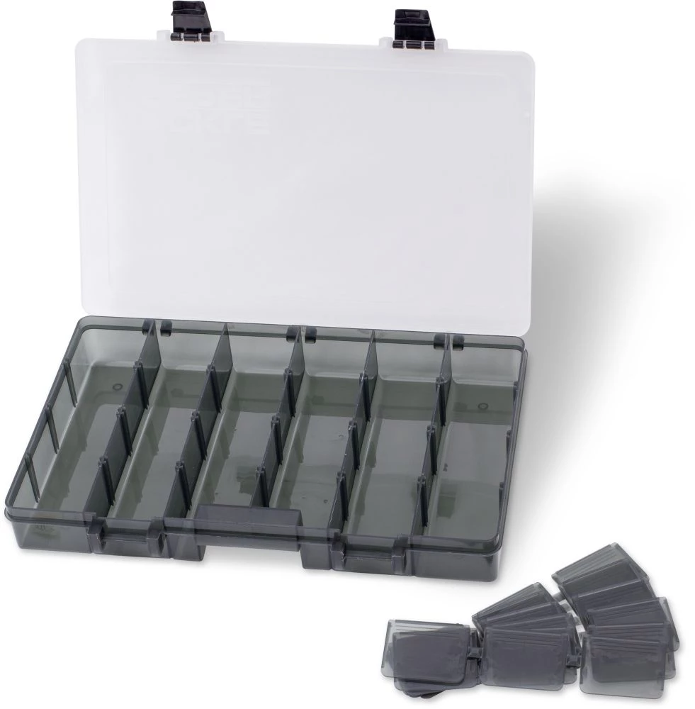 Tackle Keeper – the intelligent system boxes from Quantum High-quality X-Strong plastic material with UV protection to preserve the colouring of your lures mean that these tackle boxes are not only durable but also protect your lures and their materials. The different compartments in each model offer you the flexibility to create your own individual box for your tackle. The clips are removable, and provide a good grip and optimal closure. The transparent lid also offers you a good overview of your small accessories. The Tackle Keepers are also ‘worm-proof’, i.e. resistant to plasticisers, and therefore suitable for all soft lures.Â