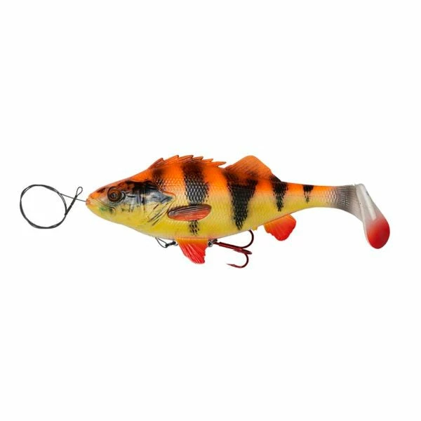 Based on a 3D Scan of a real perch with perfect details and Photo Chrome skin print and added DNA scent! The perch is in periods the main prey for Big pike and these super realistic lures will be deadly! The paddle tail make the lure rock seductively and the rattle in the tail sends out provoking clicks! The 2 smaller sizes is “ready rigged”, with the Belly treble hook mounted on a swivel, so the pike has hard time to throw the hook. The big size, is our Brilliant Linethru design, rigged with the Line thru modifier and changeable rig – the lure will slide up the trace away from the shredding teeth and the Pike cannot use the weight of the big lure to throw the hook