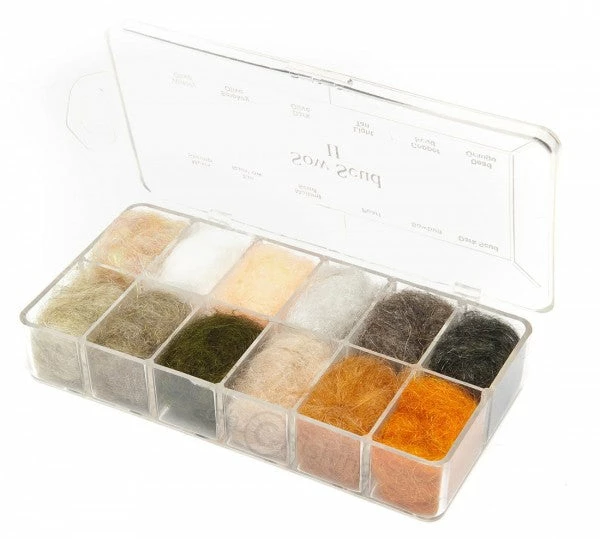 A 12 color dispenser of Wapsi Sow Scud Dubbing. Colors included: